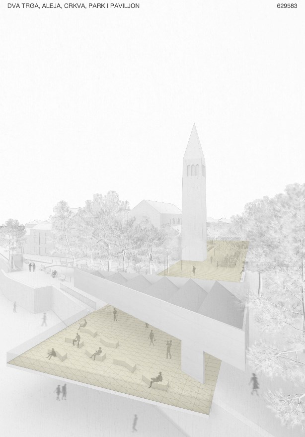 Ova pješačka zona nastala je spontano, kao odgovor na formiranje parkirališta za 104 automobila u prostoru uvijek namijenjenog pješaku (pa i u uvjetima zadnjeg natječaja). Prilažem i skice nastale direktno nakon informacije da je već provedena i javna nabava za izvedbu parkirališta s neodgodivim rokom izvedbe 27. 6., nekoliko dana prije ulaska u Evropu s obzirom da je za sjedište Komisije EU odabran upravo novi Ban-Centar.
