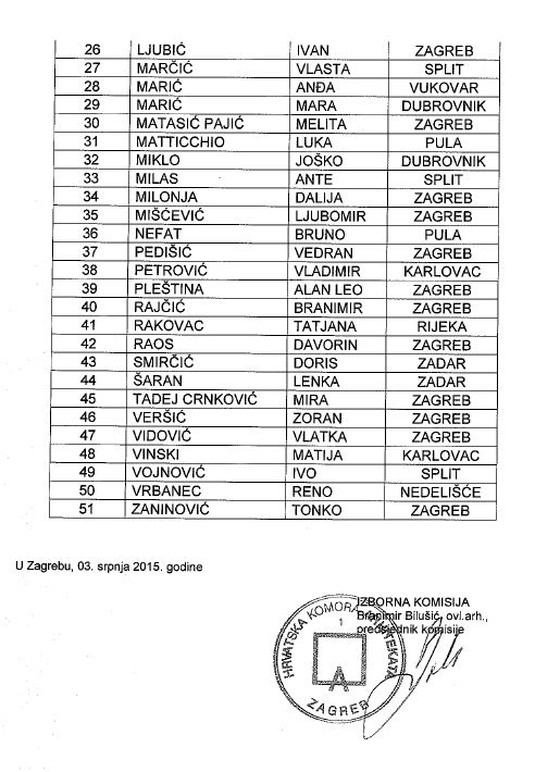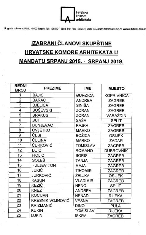 Izborna komisija u sastavu Branimir Bilušić, ovl.arh., predsjednik komisije, Tihomil Kreitmayer, ovl.arh., Vedran Duplančić, ovl.arh., Dragana Milenković, ovl.arh. i Brankica Petrović, ovl. arh., utvrdila je temeljem rezultata izbora provedenih u područnim odborima, jedinstvenu listu izabranih članova Skupštine HKA ( prema abecednom redu prezimena ) :