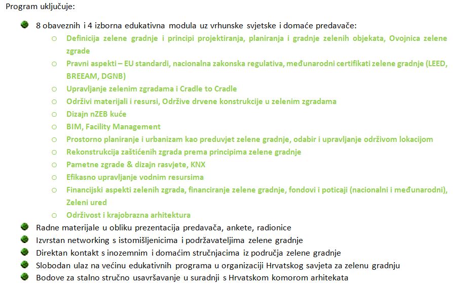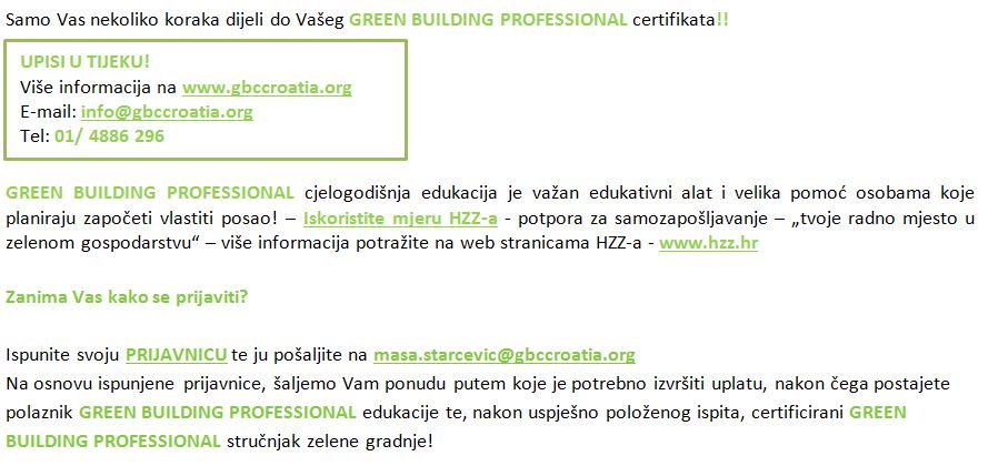 Kako bi omogućio edukaciju i profiliranje generacije međunarodno priznatih stručnjaka za zelenu gradnju u Hrvatskoj, a s ciljem što skorije implementacije zelenih principa gradnje i u našoj zemlji, Hrvatski savjet za zelenu gradnju u suradnji s drugim europskim savjetima i pod pokroviteljstvom Svjetskog savjeta za zelenu gradnju, čiji je Established član, ove godine u prosincu lansira 5. generaciju cjelogodišnjeg edukativnog programa: GREEN BUILDING PROFESSIONAL 2015/2016 koji je namijenjen profesionalcima iz različitih relevantnih disciplina, a posebno se odnosi na arhitekte i inženjere, investitore te zaposlene na projektima vezanim uz EU fondove, u javnoj upravi i financijskim institucijama koji teže usklađenosti sa najnovijim trendovima u zelenoj gradnji koje za cilj ima postizanje visoke kvalitete života i rada u prostorima i ostvarenje ušteda.