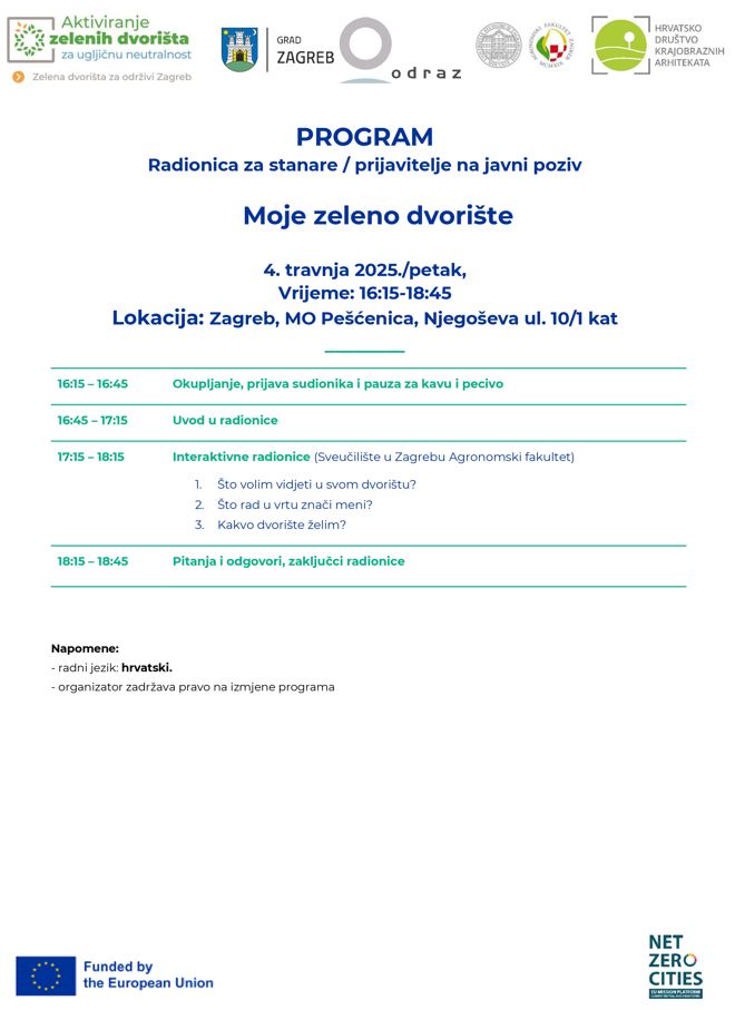 Pozivamo stanovnike gradskih četvrti Trešnjevka-sjever i jug, Maksimir i Peščenica-Žitnjak na interaktivnu radionicu “Moje zeleno dvorište”, koja će vas potaknuti na aktivno sudjelovanje u oblikovanju i održavanju zelenih površina u vašim kvartovima. Radionica za stanovnike Trešnjevke održat će se 3. travnja u Mjesnom odboru Gajevo, dok će se za stanovnike gradskih četvrti Maksimir i Peščenica-Žitnjak radionica održati 4. travnja u prostoru Mjesnog odbora Peščenica, obje u popodnevnim satima.