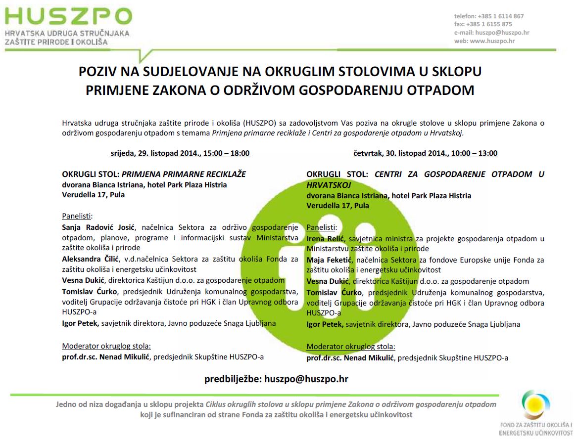 Hrvatska udruga stručnjaka zaštite prirode i okoliša (HUSZPO) Vas poziva na DVA OKRUGLA STOLA na teme: Primjena primarne reciklaže i Centri za gospodarenje otpadom u Hrvatskoj. Okrugli stolovi će se održati 29. i 30. LISTOPADA 2014., U DVORANI BIANCA ISTRIANA U HOTELU PARK PLAZA HISTRIA, U PULI (ADRESA: VERUDELLA 17).