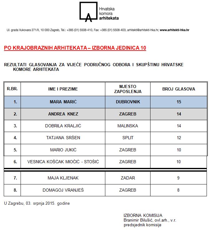 Izborna komisija u sastavu Branimir Bilušić, ovl.arh., predsjednik komisije, Tihomil Kreitmayer, ovl.arh., Vedran Duplančić, ovl.arh., Dragana Milenković, ovl.arh. i Brankica Petrović, ovl. arh., utvrdila je sljedeće rezultate za vijeća područnih odbora: